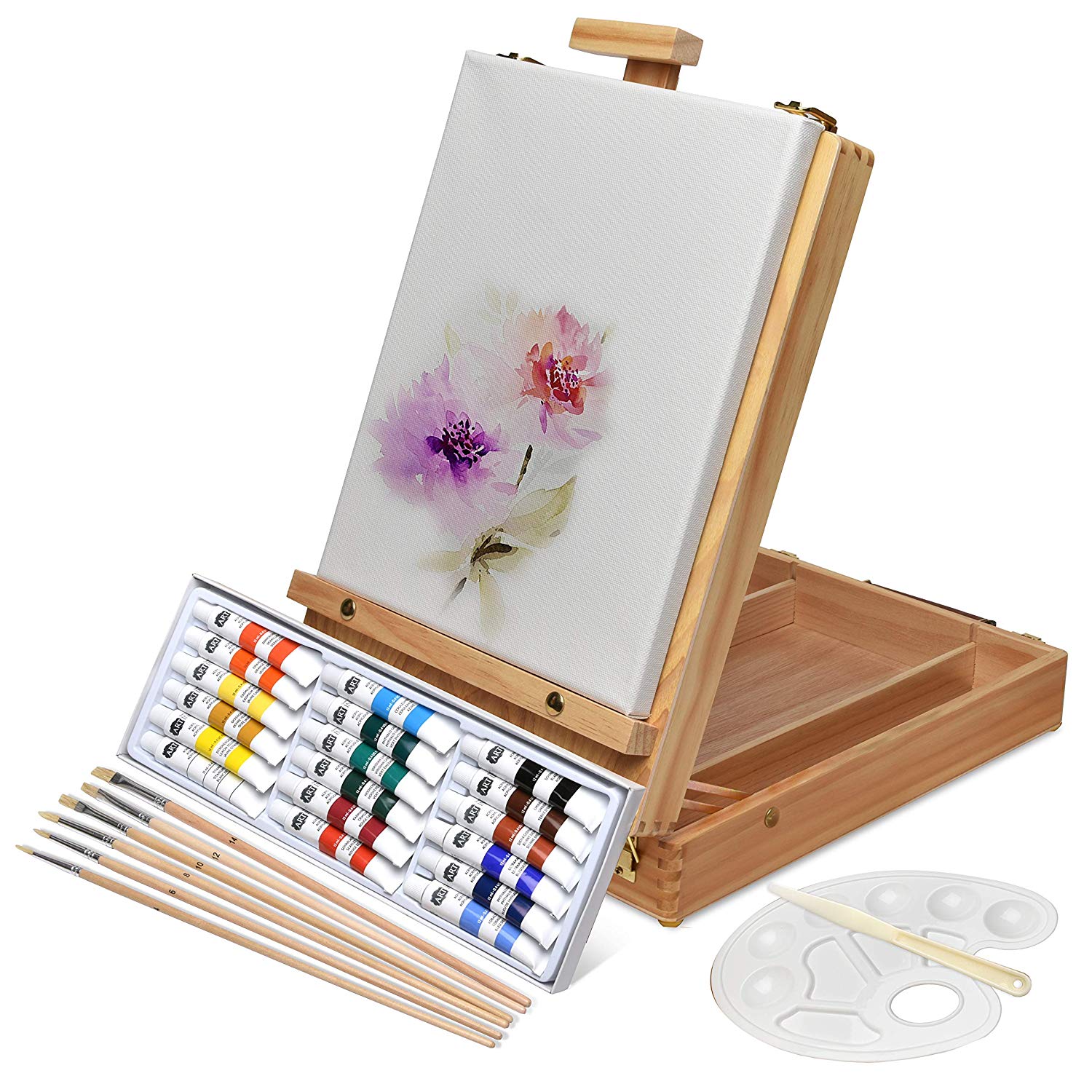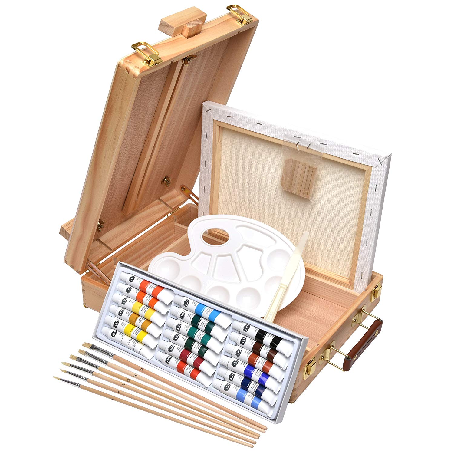Set pittura completo anche di cavalletto – La cassetta per artisti include tutti gli strumenti necessari per la pittura a olio, compreso un pratico cavalletto pittura da tavolo adatto anche agli spazi più piccoli -