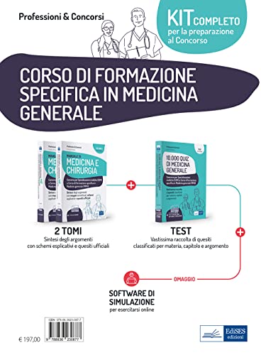 Il pacchetto di volumi è rivolto ai candidati per la preparazione alle prove di ammissione alle Scuole di Specializzazione mediche e al Concorso per il corso di formazione specifica in Medicina generale. Il kit è composto da due volumi: Manuale di Medicina e Chirurgia (2 tomi): sintesi degli argomenti con schemi esplicativi e quesiti ufficiali; 10.000 quiz di Medicina generale: vastissima raccolta di quesiti classificati per materia, capitolo e argomento In omaggio con l’acquisto del pacchetto il software di simulazione per infinite esercitazioni, allegato ai volumi.