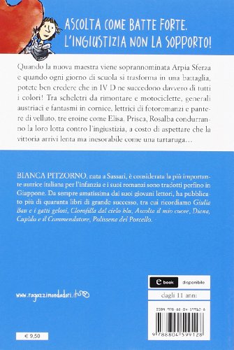 Quando la nuova maestra viene soprannominata Arpia Sferza e quando ogni giorno di scuola si trasforma in una battaglia, potete ben credere che in IV D ne succedono davvero di tutti i colori! Tra scheletri da rimontare e motociclette, generali austriaci e fantasmi in cornice, lettrici di fotoromanzi e pantere di velluto, tre eroine come Elisa, Prisca, Rosalba condurranno la loro lotta contro l’ingiustizia, a costo di aspettare che la vittoria arrivi lenta ma inesorabile come una tartaruga… Età di lettura: da 11 anni.
