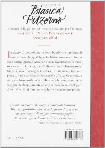 In classe di Leopoldina ci sono bambini e bambine di tutti i colori che qualche volta bisticciano, ma in fondo sono amici. Quando Aureliano viene ingiustamente punito, cercano di farla pagare all’odiosa maestra Ermentruda. Ma una polverina magica riserva a tutti un’incredibile sorpresa… E una sorpresa attende anche Etrusca Cruscòn! La strega ha bisogno di un giaciglio speciale: cinque materassi di piume di spiumaccione, che si trovano solo nel giardino del re. E lui non vuole cederne neanche una piuma! Prefazione di Roberto Denti. Età di lettura: da 7 anni.