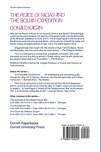 Why did the Peace of Nicias fail to reconcile Athens and Sparta? Donald Kagan examines the years between the signing of the peace treaty and the destruction of the Athenian expedition to Sicily in 413 B.C. The principal figure in the narrative is the Athenian politician and general Nicias, whose policies shaped the treaty and whose military strategies played a major role in the attack against Sicily.