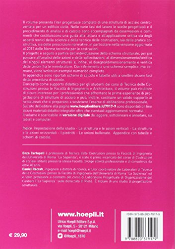 Il volume presenta l’iter progettuale completo di una struttura di acciaio controventata per un edificio civile. Nelle varie fasi del lavoro le scelte progettuali e il procedimento di analisi e di calcolo sono accompagnati da osservazioni e commenti che costituiscono una guida alla lettura e all’applicazione critica sia degli aspetti teorici della scienza e della tecnica delle costruzioni, sia della pratica costruttiva, sia delle prescrizioni normative, in particolare nella versione aggiornata al 2017 delle Norme tecniche per le costruzioni. Il progetto è seguito a partire dall’individuazione dello schema strutturale, per poi passare all’analisi delle azioni e delle sollecitazioni, al dimensionamento/verifica dei singoli elementi strutturali e, infine, al disegno/dimensionamento e verifica delle unioni fra le membrature. Con riferimento a uno schema semplice, ma comune, viene svolto un esempio numerico completo. In appendice sono riportati schemi di calcolo e tabelle utili a snellire alcune fasi della procedura di calcolo. Concepito come supporto didattico per gli studenti dei corsi di Tecnica delle Costruzioni presso le Facoltà di Ingegneria e Architettura, il volume può risultare di sicuro interesse per i professionisti che affrontano le prime esperienze di progettazione di strutture di acciaio e può, inoltre, costituire un valido supporto ai neolaureati che si preparano a sostenere l’esame di abilitazione professionale. Sul sito dell’editore alla pagina hoeplieditore.it/7917-9 sono disponibili on line alcuni materiali didattici integrativi oltre che eventuali aggiornamenti normativi. Il volume è scaricabile in versione digitale da leggere, sottolineare e annotare, su tablet e computer.