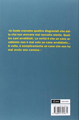 Quanta rabbia, quanto cuore, quanti sogni, quanto dolore, quanto azzurro c’è in fondo alla strada? Il primo romanzo di Kekko dei Modà. In fondo eravamo quattro disgraziati che dalla vita non avevano mai raccolto niente. Quattro cani arrabbiati. La verità è che un cane arrabbiato non è mai solo un cane arrabbiato… A volte, è semplicemente un cane che non ha mai avuto una carezza Cash è un vero buono, di quelli che esistono solo nei film. Viene da Cerignola, ama la sua famiglia, ama Samantha e non ha un lavoro stabile, perché, a suo modo, è un ribelle. Qualcuno lo prende anche per un violento, perché un senso profondo e quasi irrazionale della giustizia gli arma spesso pugni tanto maldestri quanto potenti. Samantha lo lascia, il padre è severamente malato, soldi non ce ne sono: tutto sembra precipitare. E allora Cash va incontro al suo destino: per una strana concatenazione di eventi si ritrova in Colorado, Usa, dove ha luogo un mega reality sulla boxe. Centinaia di atleti sconosciuti si battono per affrontare, infine, il campione del mondo in carica a Las Vegas. E Cash è là, a combattere, in un delirio di ring, tribune, maxi-schermi, telecamere, roulotte e tende, sotto gli occhi del mondo. Quanta rabbia, quanto cuore, quanti sogni, quanto dolore, quanto azzurro c’è in fondo alla strada?