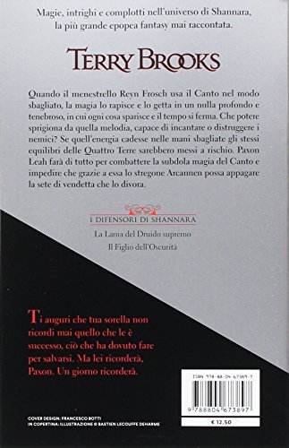“Quando il menestrello Reyn Frosch usava il Canto nel modo sbagliato, reagendo per collera o per paura, la magia lo rapiva e lo gettava in un nulla profondo e tenebroso, un luogo in cui ogni cosa spariva e il tempo si fermava. Accadeva all’improvviso e senza avvertimento. Era come se venisse strappato dal suo stesso corpo.” Che eccezionale potere sprigiona da questo Canto, capace di incantare o distruggere i propri nemici? Un dono da nascondere, da proteggere gelosamente? Se quell’energia cadesse nelle mani sbagliate gli stessi equilibri delle Quattro Terre sarebbero messi a rischio. Paxon Leah, protettore dell’Ordine dei Druidi, è ben consapevole del rischio; sa che agli estremi confini, nei lontani villaggi delle Terre del Sud, la minaccia del Canto Magico si è già manifestata, sa di dover intervenire facendo appello al suo sangue, al coraggio della dinastia guerriera che un tempo regnava sulle Terre Alte. Ancora stremato dallo sconvolgente duello con lo stregone Arcannen, senza più il sostegno del Druido Supremo, è compito di Paxton combattere la subdola magia. E farà di tutto per riuscire nell’impresa, prima che Arcannen catturi il menestrello, carpisca il segreto del Canto Magico e appaghi la sete di vendetta che lo divora. “Il Figlio dell’Oscurità” è il secondo libro dei “Difensori di Shannara”.