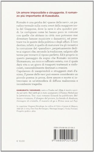 Komako è una geisha del “paese delle nevi”, un paradiso termale sulla costa ovest della maggiore isola del Giappone, dove la neve è alta quindici piedi. Le cortigiane come lei hanno poco in comune con quelle che abitano in città: non potranno mai diventare famose musiciste o danzatrici, né penetrare tra le quinte della politica o degli affari. Il loro destino, infatti, è quello di maturare tra gli incanti e la corruzione del “paradiso”, perpetuamente dedite ai signori che, secondo la tradizione, salgono alle terme per trovarvi il riposo perfetto. Ed è proprio in questo paesaggio da sogno che Komako incontra Shimamura, un ricco e raffinato esteta, con il quale darà vita a un gioco di trasporti trattenuti e rinfocolati, inesorabilmente destinati a svanire. Capolavoro di inesprimibili e struggenti stati d’animo, Il paese delle nevi può essere considerato un piccolo poema in prosa, dove amore e morte si intrecciano in un’atmosfera di diffusa malinconia e incombente tragedia.