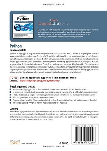 Python è un linguaggio di programmazione multipiattaforma, robusto e maturo, a cui si affidano le più prestigiose aziende e organizzazioni a livello mondiale, come Google, la NASA, YouTube, Intel e Yahoo! Il suo successo è legato sia al fatto che favorisce la produttività, rendendo semplice lo sviluppo di sistemi software anche molto complessi, sia al fatto che ha molteplici ambiti di utilizzo: applicazioni web, giochi e multimedia, interfacce grafiche, networking, applicazioni scientifiche, intelligenza artificiale, programmazione di sistema e tanto altro ancora. Questo libro è la più completa, moderna e dettagliata guida a Python attualmente disponibile, aggiornata all’ultima release del linguaggio (Python 3.4) rilasciata nel gennaio 2014. La trattazione è molto dettagliata e segue un percorso graduale costruito attorno a una ricca serie di esempi ed esercizi: si parte dalle basi del linguaggio, senza dare nulla per scontato, sino ad arrivare agli argomenti considerati ostici anche dai programmatori più esperti.