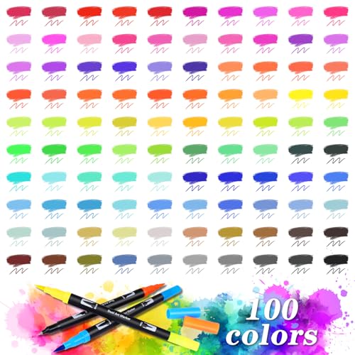 PITMT Brush Pen Lettering 100 Colori, Pennarelli Doppia Punta Fine e Grossa Pennello, Pennarelli Acquerellabili Professionali Adulti Bambini Penne Colorate Bullet Journal Lettering Mandala e Disegnare