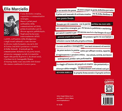 In un mondo che pensa di avere sempre la guida definitiva per tutto, il primo anti manuale di scrittura creativa che fa della ribellione il suo punto focale. Pensato per chi comunica – con la parola scritta ma non solo – per copywriter, strategist, per chi lavora in pubblicità e marketing, e per coloro che sono in cerca di nuovi percorsi creativi e di pensiero che possano aprire vie non battute e infondere nuova linfa alla propria scrittura. Il suo essere ribelle sta tutto nell’approccio e nella forma: è anti perché è un manuale che non ha la presunzione di insegnare regole fisse e valevoli per tutti, ma modi di essere rispetto al mestiere stesso di scrivere, a metà tra un saggio, un’autobiografia, un paper. Ciò che ne emerge è un testo analitico e immaginifico, che si interroga sull’essere umano scrivente e su come diventare un essere umano scrivente migliore, con tanti strumenti ed esercizi da poter mettere in pratica fin da subito per affinare tecnica, capacità di ragionamento e pensiero critico, tra cultura, musica rock, punk, società, movimenti underground, poesia e arte performativa. Un viaggio all’interno del proprio sé creativo che permetterà, a chiunque abbia coraggio, di abbandonare certi schemi noti per rendere ribelle la propria forma mentis e il proprio scrivere.