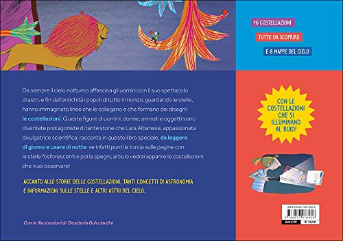 Da sempre il cielo notturno affascina gli uomini con il suo spettacolo di astri, e fin dall’antichità i popoli di tutto il mondo, guardando le stelle, hanno immaginato linee che le collegano e che formano dei disegni: le costellazioni. Queste figure di uomini, donne, animali e oggetti sono diventate protagoniste di tante storie che Lara Albanese, appassionata divulgatrice scientifica, racconta in questo libro speciale, da leggere di giorno e usare di notte: se infatti punti la torcia sulle pagine con le stelle forsorescenti e poi la spegni, al buio vedrai apparire le costellazioni che vuoi osservare! Accanto alle storie di sedici costellazioni, ci sono anche tanti concetti di astronomia, per conoscere qualcosa di più sulle stelle, perché partire alla scoperta del cielo stellato è un’avventura che riserva sempre nuove sorprese! Età di lettura: da 7 anni.