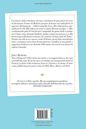 Un classico della letteratura sul tema, considerato da generazioni un testo di riferimento, “Il mare” di Michelet propone al lettore una molteplicità di approcci all’argomento – dall’oceanografia fisica all’evoluzionismo, passando per la vita delle balene, le sirene e i pirati del mare (i polpi) – e offre continuamente punti di vista diversi e inaspettati. In questo modo ci restituisce il mare come elemento familiare, intimo («quasi una persona»), e allo stesso tempo radicalmente estraneo, che contiene «la forza vitale del Tutto» Tramite lo stile, questo libro riesce a integrare un’accurata documentazione scientifica in una grande metafora su un elemento della natura che non ha mai smesso di ispirare l’umanità.