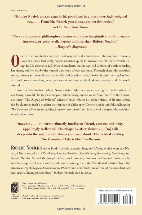 One of this century’s most original philosophical thinkers, Nozick brilliantly renews Socrates’s quest to uncover the life that is worth living. In brave and moving meditations on love, creativity, happiness, sexuality, parents and children, the Holocaust, religious faith, politics, and wisdom, The Examined Life brings philosophy back to its preeminent subject, the things that matter most. We join in Nozick’s reflections, weighing our experiences and judgments alongside those of past thinkers, to embark upon our own voyages of understanding and change.