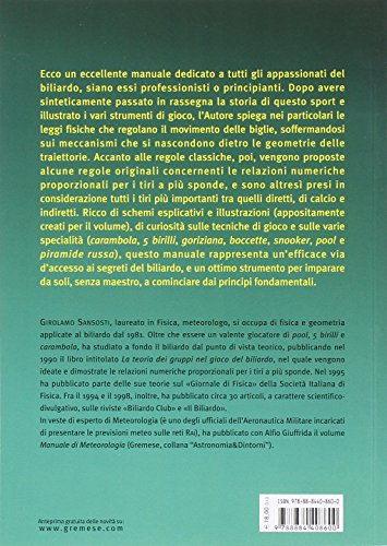 Un manuale dedicato a tutti gli appassionati del biliardo, siano essi professionisti o principianti. Dopo avere sinteticamente passato in rassegna la storia di questo sport e illustrato i vari strumenti di gioco, l’autore spiega nei particolari le leggi fisiche che regolano il movimento delle biglie, soffermandosi sui meccanismi che si nascondono dietro le geometrie delle traiettorie. Accanto alle regole classiche, poi, vengono proposte alcune regole originali concernenti le relazioni numeriche proporzionali per i tiri a più sponde, e sono altresì presi in considerazione tutti i tiri più importanti tra quelli diretti, di calcio e indiretti. Ricco di schemi esplicativi e illustrazioni (appositamente creati per il volume), di curiosità sulle tecniche di gioco e sulle varie specialità (carambola, 5 birilli, goriziana, boccette, snooker, pool e piramide russa), questo manuale rappresenta un’efficace via d’accesso ai segreti del biliardo, e uno strumento per imparare da soli, senza maestro, a cominciare dai principi fondamentali. Con le regole di tiro adatte a tutte le specialità mondiali.