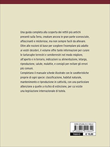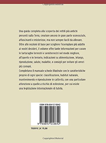 Questo libro vi guida alla scoperta dei rettili più antichi presenti sulla terra, creature ancora in gran parte sconosciute, affascinanti e misteriose, non sempre facili da allevare. Si propone, inoltre, di illustrare tutti gli aspetti pratici delle tartarughe di terra e semiterrestri, fornendo anche un aiuto concreto a chi intende allevare nelle migliori condizioni questi meravigliosi animali. Spiega accuratamente come funziona il loro organismo per rispettare meglio le loro esigenze, in modo tale da poter scegliere l’esemplare più adatto alle vostre possibilità di allevamento. Come mantenerle nel modo migliore, all’aperto e in un terrario, evitando gli errori più comuni, fornendovi le indicazioni più complete su alimentazione, letargo, riproduzione, salute e malattie. È ricco di schede con le immagini e le caratteristiche proprie di ogni specie: classificazione, habitat naturale, mantenimento e riproduzione in cattività; una particolare attenzione è dedicata a quelle a rischio di estinzione, per le quali esiste una legislatura internazionale di tutela.