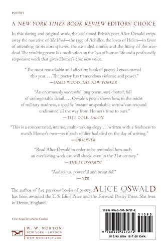 In this daring new work, the poet Alice Oswald strips away the narrative of the Iliad-the anger of Achilles, the story of Helen-in favor of attending to its atmospheres: the extended similes that bring so much of the natural order into the poem and the corresponding litany of the war-dead, most of whom are little more than names but each of whom lives and dies unforgettably and unforgotten in the copious retrospect of Homer’s glance. The resulting poem is a war memorial and a profoundly responsive work that gives new voice to Homer’s level-voiced version of the world. Through a mix of narrative and musical repetition, the sequence becomes a meditation on the loss of human life.