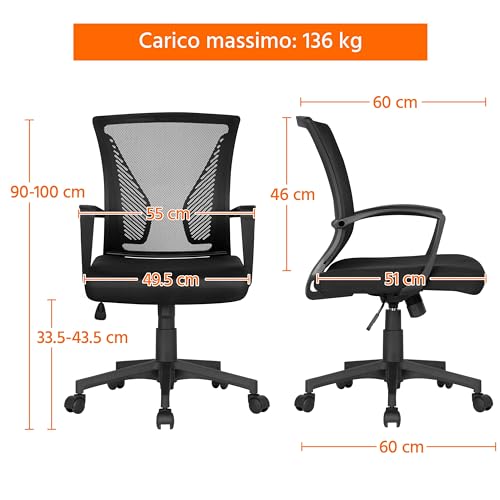 Yaheetech Sedia da Ufficio Scrivania Ergonomica Lombare in Rete Traspirante Reclinabile Altezza Regolabile Girevole con Braccioli e Ruote Portata 136 kg Nera