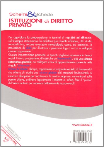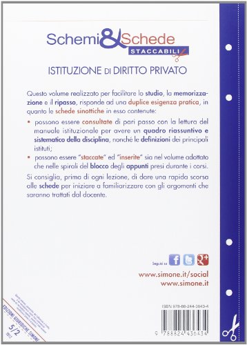 Questo volume, realizzato per facilitare lo studio, la memorizzazione e il ripasso, risponde ad una duplice esigenza pratica, in quanto le schede sinottiche in esso contenute: possono essere consultate di pari passo con la lettura del manuale istituzionale per avere un quadro riassuntivo e sistematico della disciplina, nonché le definizioni dei principali istituti; possono essere “staccate” ed “inserite” sia nel volume adottato che nelle spirali del blocco degli appunti presi durante i corsi. Si consiglia, prima di ogni lezione, di dare una rapida lettura alle schede per iniziare a familiarizzare con gli argomenti che saranno trattati dal docente.