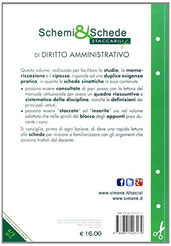 I testi della collana Schemi & Schede raccolgono tutti gli argomenti del programma d’esame in schemi e schede sinottiche, ponendosi come indispensabile sussidio del manuale adottato. Ogni Schemi & Schede: delinea un quadro sistematico della materia; identifica come in una slide i punti chiave e le linee generali della disciplina; dedica maggiore attenzione agli argomenti caldi più frequentemente oggetto di domande d’esame; facilita la lettura, agevola la memorizzazione, velocizza il ripasso. In più, questi manuali sono strutturati in pagine staccabili che possono anche essere inserite nei quadernoni a fogli mobili utilizzati per prendere appunti durante le lezioni. L’utilizzo di Schemi & Schede, strutturato in tavole sinottiche e schemi articolati, presuppone una minima conoscenza di base della materia: si raccomanda sempre la contestuale consultazione del manuale istituzionale o del Compendio Simone. Questa nuova edizione di Schemi & Schede di Diritto Amministrativo, aggiornata come sempre alle ultime novità normative, si giova della consueta veste grafica che affianca agli schemi tre differenti rubriche: Osservazioni, dove si approfondiscono aspetti rilevanti della disciplina; Differenze, dove si analizzano aspetti particolari della materia, stimolando i confronti e i paralleli fra i diversi istituti; In sintesi, dove si offre un quadro riepilogativo degli argomenti affrontati. L’utilizzo del secondo colore trasforma, infine, lo studio delle grigie pagine dei manuali tradizionali in uno strumento di apprendimento più vivace ed efficace.