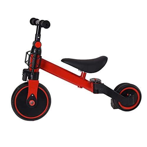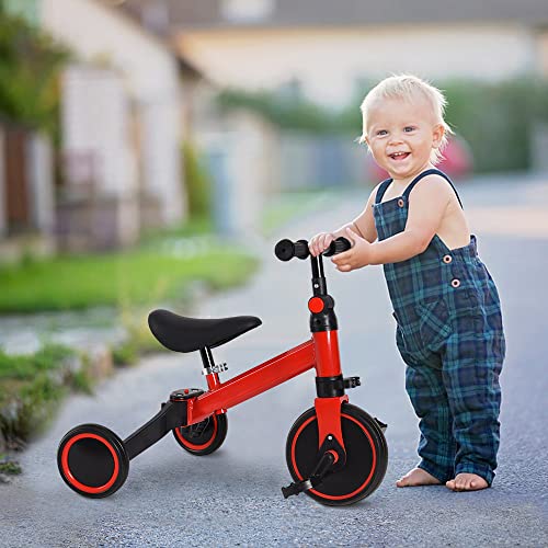 OLYSPM 5 in 1 Triciclo bambini 1 anno Bici senza pedali,Pedali rimovibili e Ruote ausiliarie pieghevoli,Sella e manubrio regolabili,Pieghevole Triciclo,Triciclo con maniglione(Rosso)